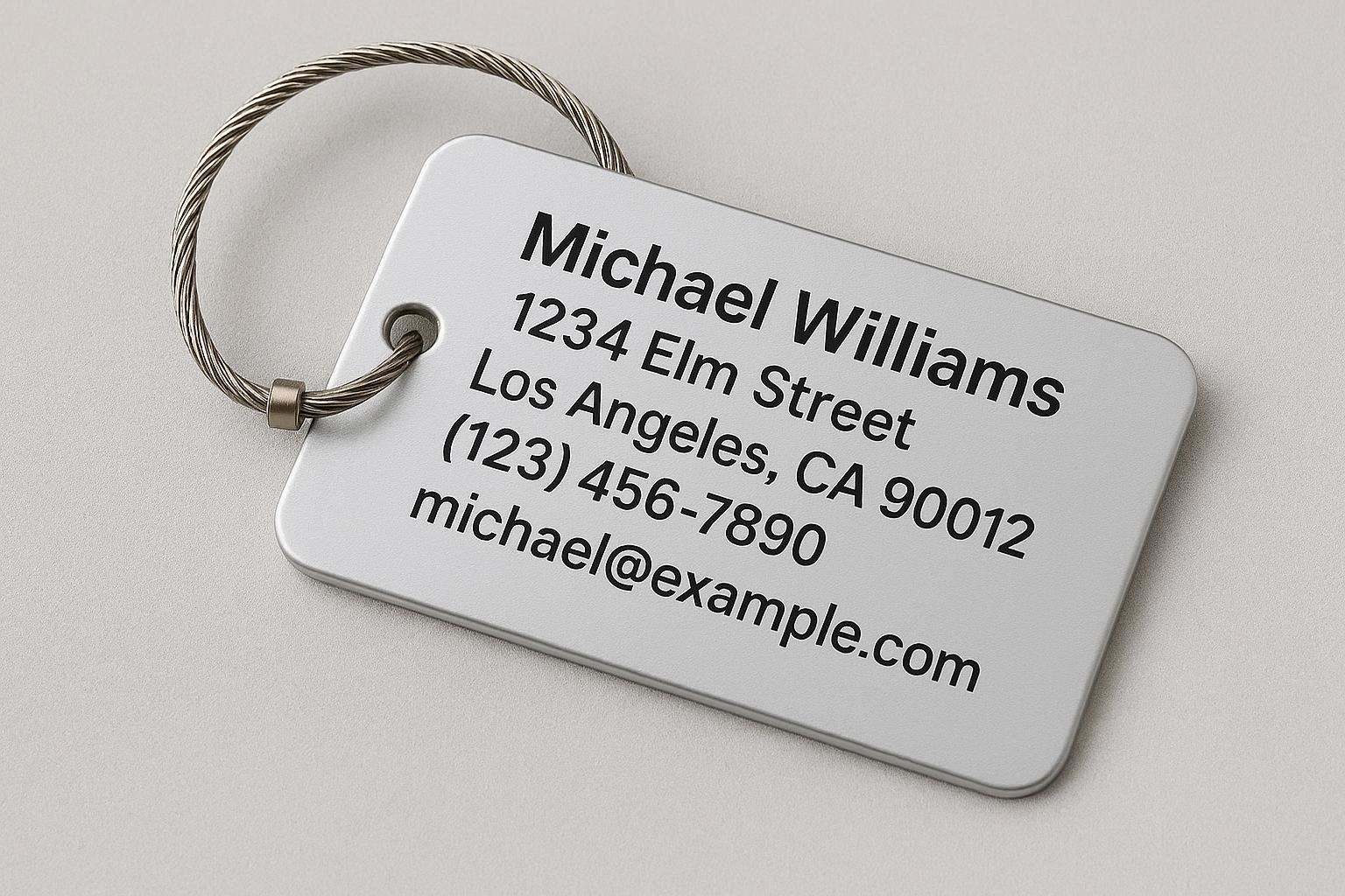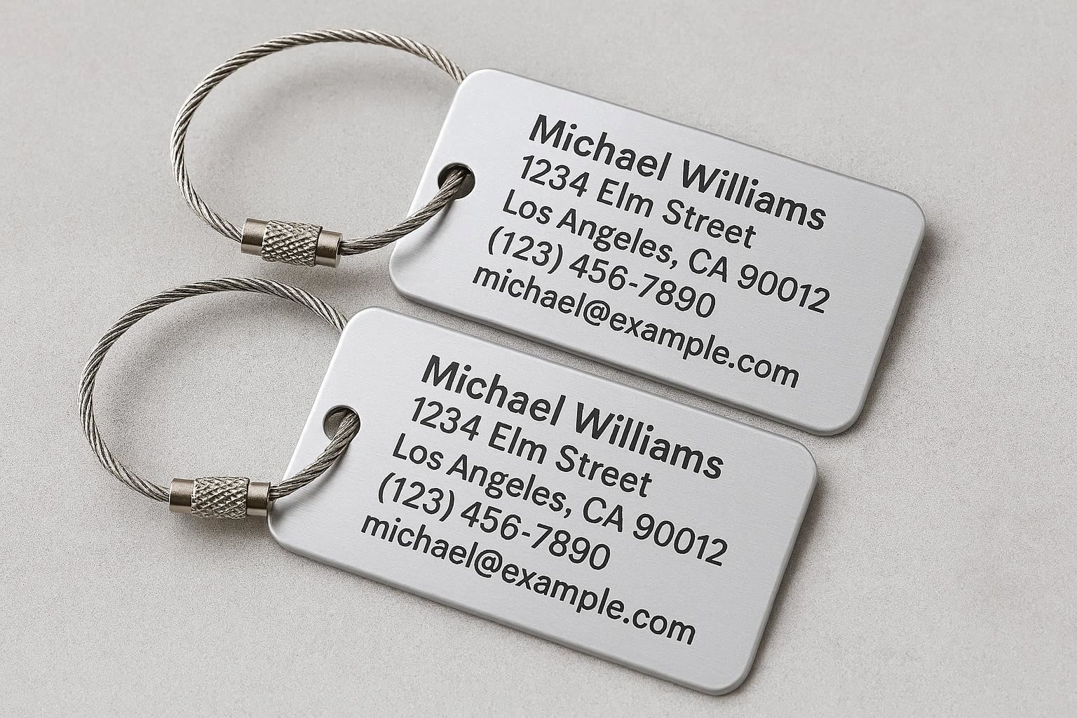 Constructed from lightweight yet robust anodized aluminum, these luggage tags offer a sleek, modern, and virtually indestructible way to identify your baggage. The tag measures 2.75 by 1.75 inches and is only 2mm thick, adding minimal weight. Your personal information, such as name and phone number, is precision laser engraved directly onto the metal surface, ensuring it will never fade, smear, or rub off.