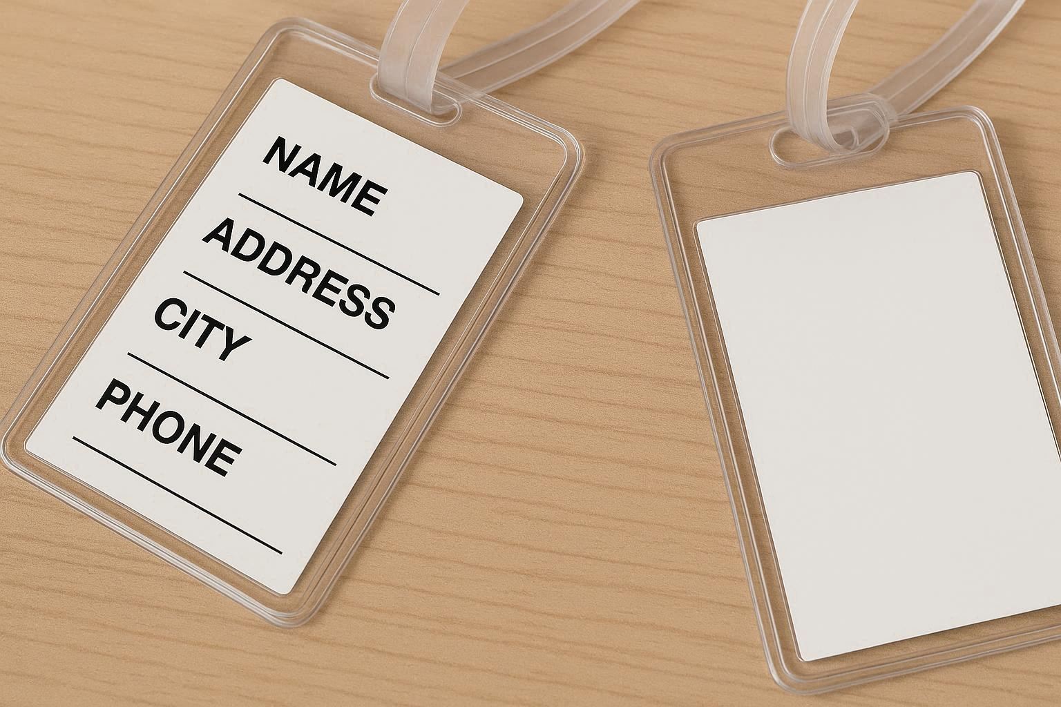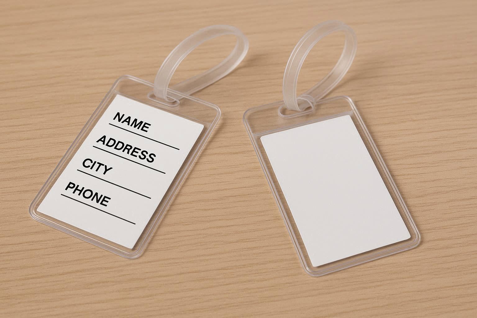 The tag is sealed on all four sides, ensuring the insert is completely protected from rain, spills, and handling. A strong, reinforced hole and a durable plastic strap allow for secure attachment to luggage zippers or handles. The plastic is resistant to tearing and cracking, even in extreme temperatures commonly experienced during air travel.