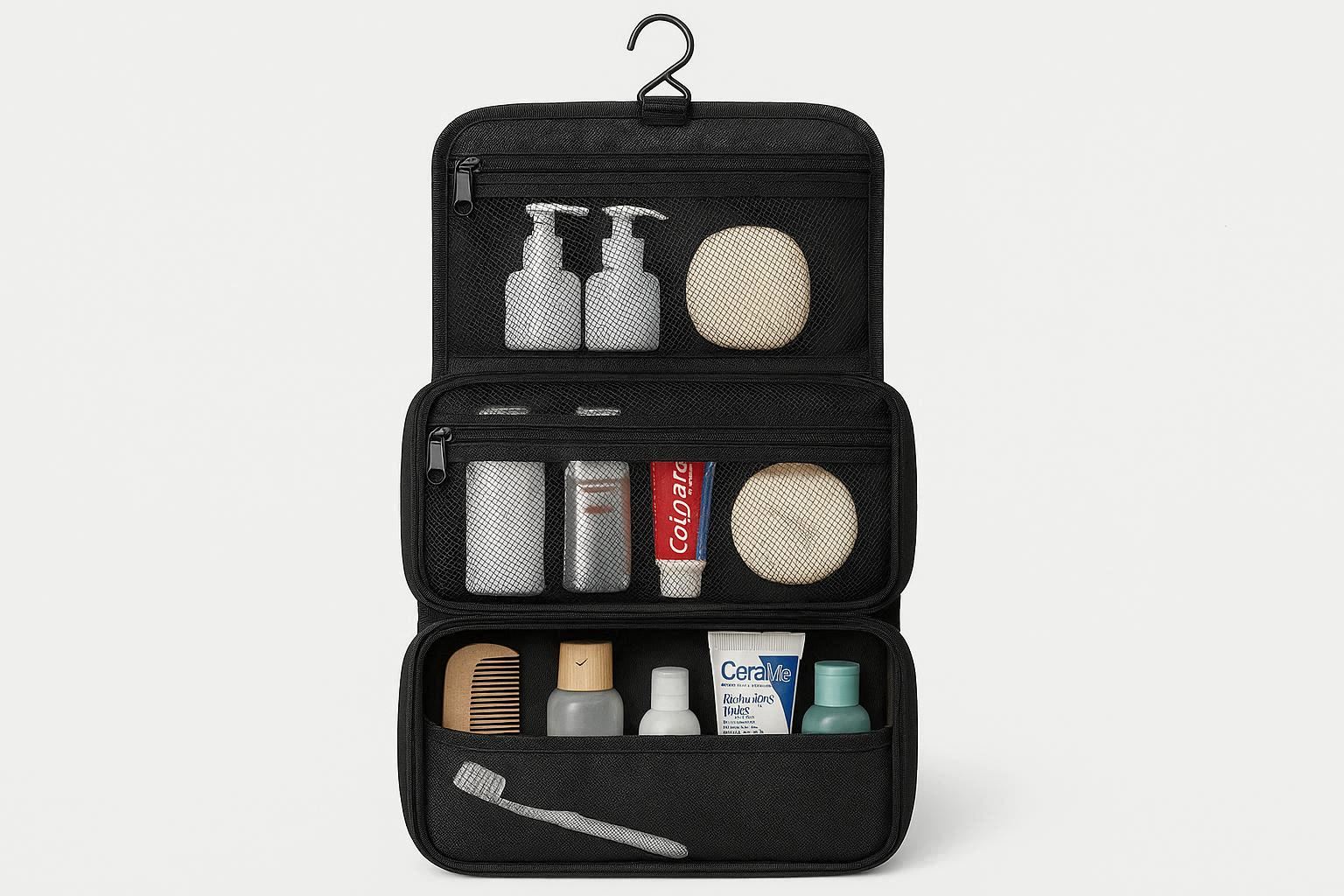 This large capacity toiletry organizer is built for family trips or group travel. It features multiple independent compartments, allowing you to separate toiletries by family member or product type. Made from sturdy, water resistant polyester, it includes a central hanging hook and sturdy carry handles for multiple transport options.